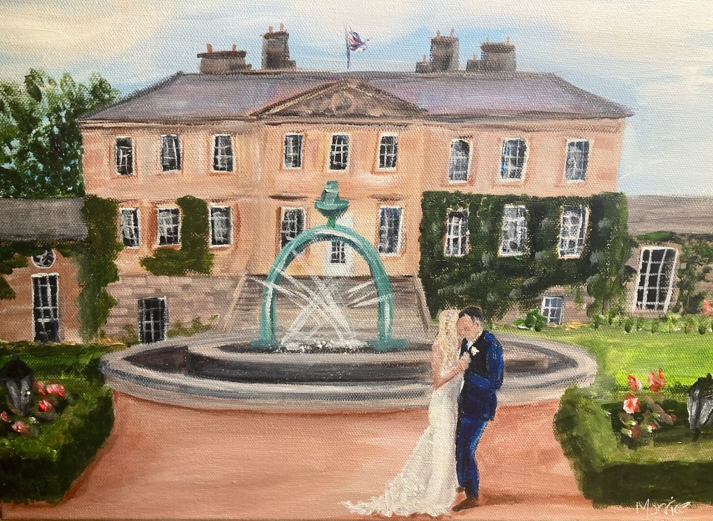 An impressionist style painting on watercolour paper. Includes the venue and couple and any additional details.