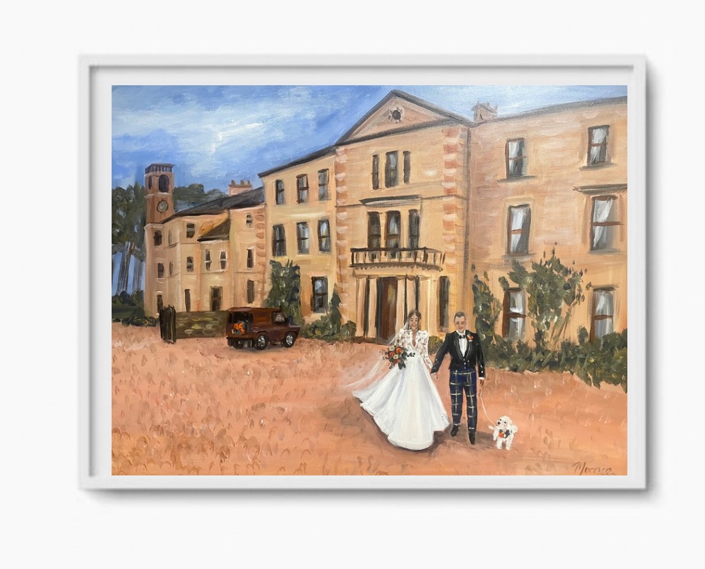 Together, we’ll discuss the mood, setting, and framing style you love to ensure your artwork feels personal and timeless. - Planning your artwork: Ahead of your wedding, I will coordinate with you, or your planner to finalise the details. From selecting the perfect scene and canvas size to deciding between oil or watercolour, this is where your ideas take shape. We’ll also take note of key features, like special florals, outfits, or meaningful backdrops (or dogs) you’d like included.